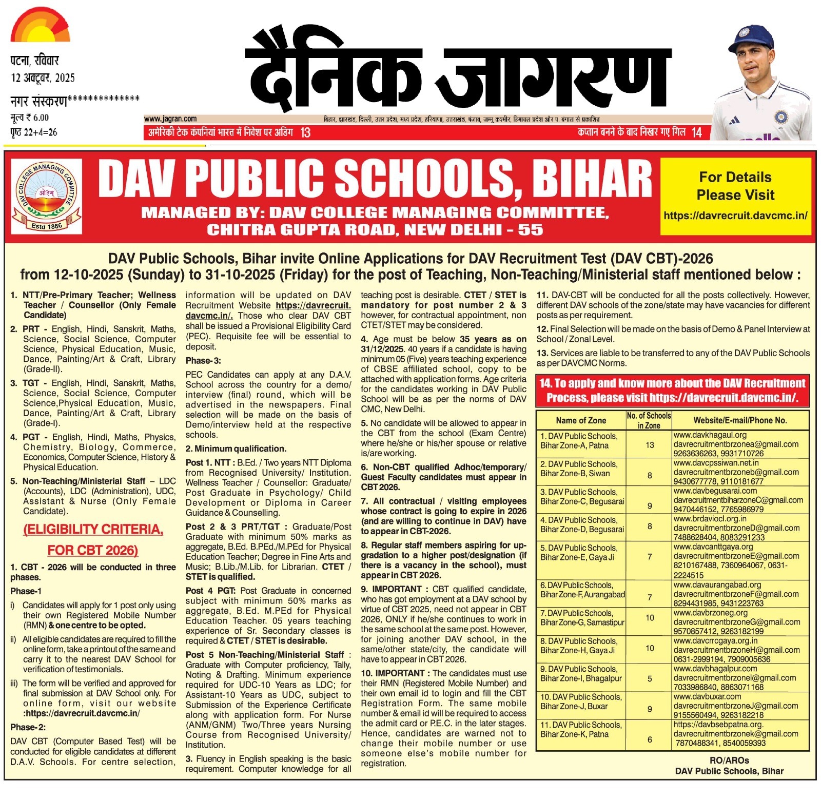 DAV public Schools,Bihar invite Online Applications for DAV Recruitment Test (DAV CBT)-2026.